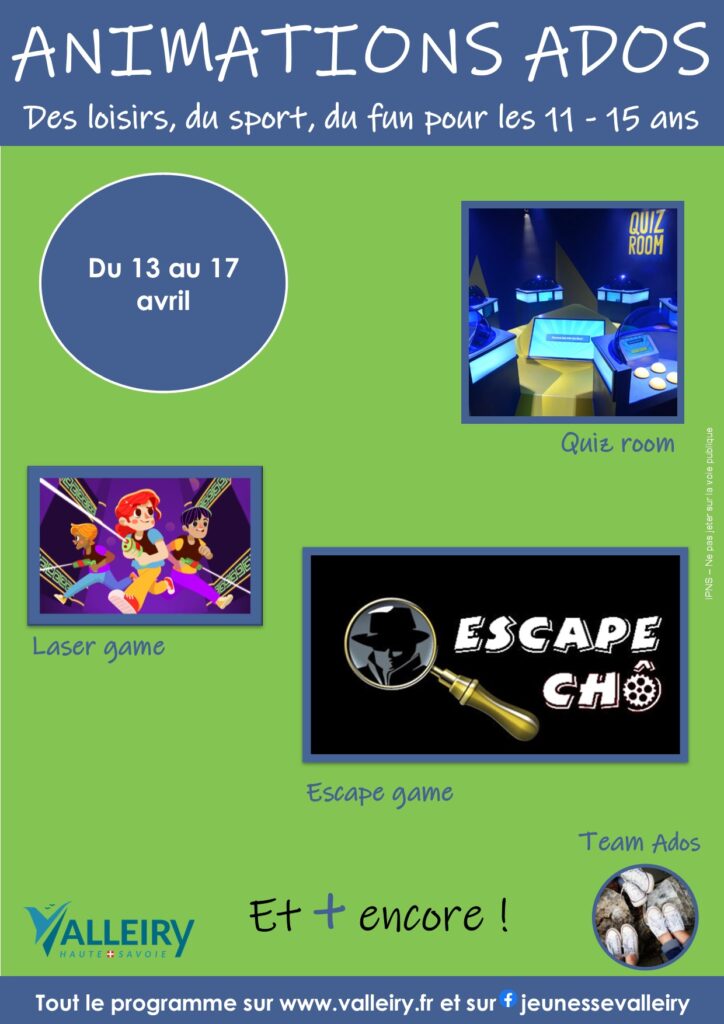 Animations ados ven. 13 mars 2026 webmaster_valleiry Téléchargez : Le programme complet La fiche d’inscription La fiche sanitaire Le règlement des animations ados Uncategorized